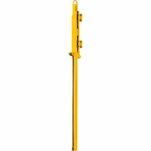 The ladder safety post supports fixed ladders under access doors and manhole covers creating easy ingress and egress points. The lock up bracket automatically locks in the fully raised position for user stability, fall prevention, and safety. The release lever allows the post to be easily lowered to its retracted position for easy operation. The steel construction is designed to support heavy duty ladders making it ideal for harsh environments and working conditions. Yellow powder coat finish offers high unit visibility while preventing weather related rust, oxidation, and corrosion. The adjustable mounting hardware accommodates multiple ladder rung sizes and spacing. Includes a pull up loop designed to assist in raising the post for user convenience. Features stainless steel mounting bolts. Ships fully assembled. Dimensions are 63″L x 5-1/2″W x 3″H.