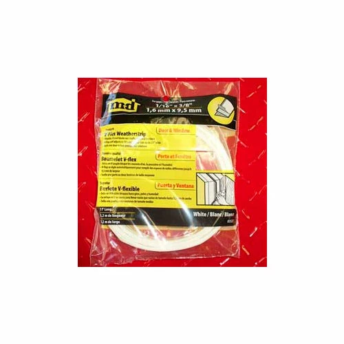 V-Flex Weatherstrip from M-D is a polypropylene weatherstrip with an adhesive back. This is a superior self-adhesive V-shaped plastic weather-strip for sealing doors and windows and installs on the door jamb. 03525, White, 7/8″W x 17’L.