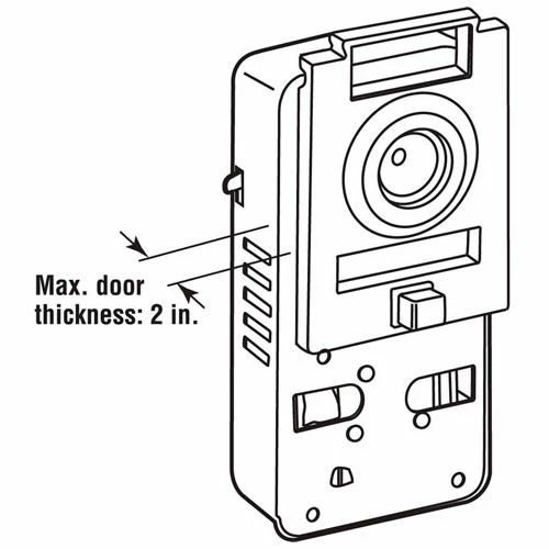 Used for up to 2″ thick doors. Non-electric chime with 200° eye viewer. Brass/white finish. Space for nameplate.
